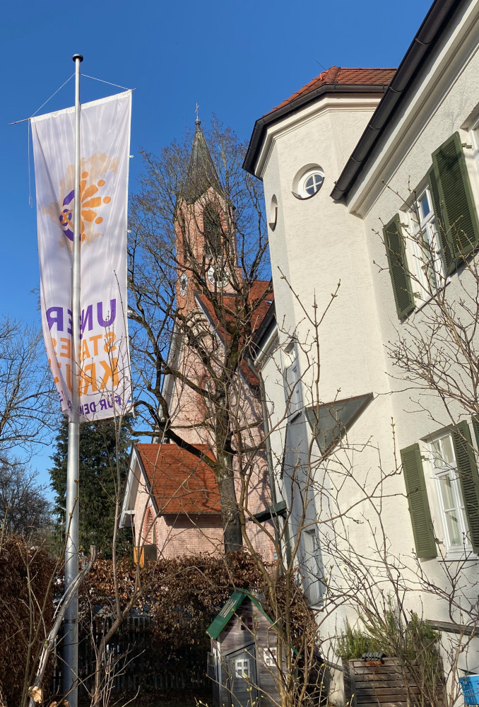Evang.-Luth. Kirchengemeinde Haßfurt, Christuskirche und GemeindehausDie Fahnen und Banner mit dem "Starken Kreuz für Demokratie" hängen und wehen an über 140 Kirchen und Gemeindehäusern in ganz Bayern. Hier von die Bilder aus dem Kreuz+Quer-Haus der Kirche Erlangen, der Kirche in Plattling und der St. Anna Kirche Eckental-Forth.