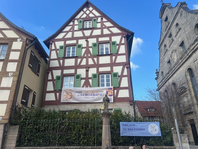 Evang.-Luth. Kirchengemeinde Haßfurt, Christuskirche und GemeindehausDie Fahnen und Banner mit dem "Starken Kreuz für Demokratie" hängen und wehen an über 140 Kirchen und Gemeindehäusern in ganz Bayern. Hier von die Bilder aus dem Kreuz+Quer-Haus der Kirche Erlangen, der Kirche in Plattling und der St. Anna Kirche Eckental-Forth.